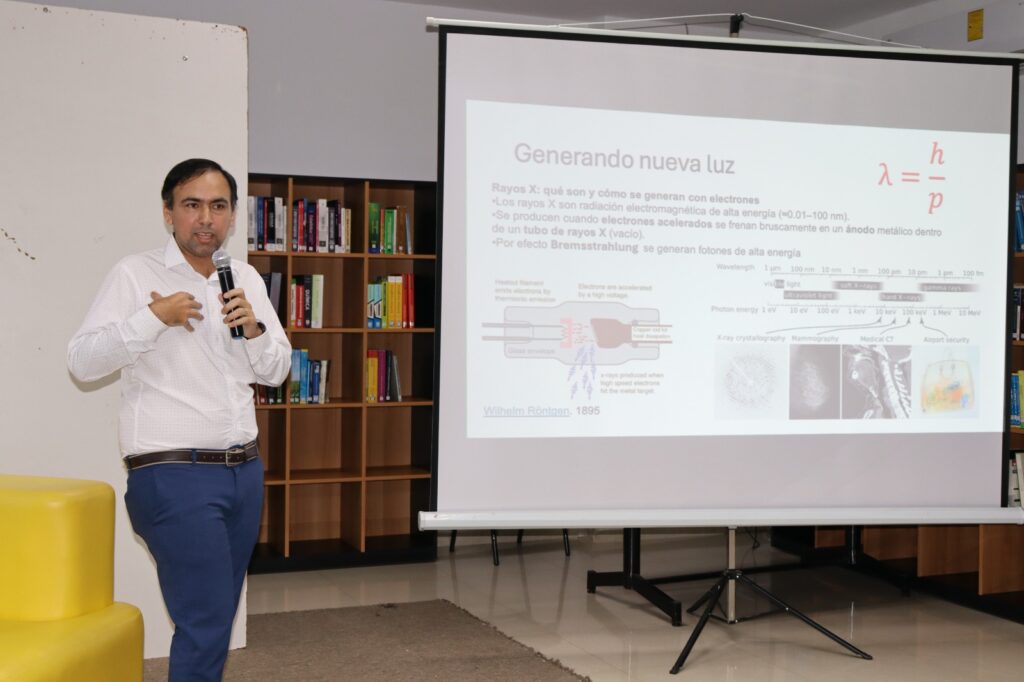 La charla versó sobre los grandes descubrimientos y avances en la tecnología médica, de las telecomunicaciones y en la solución de problemas de la vida cotidiana en el mundo, entre otros que la aceleración de partículas ha logrado en la historia reciente, como el internet, la telefonía móvil y las energías renovables.